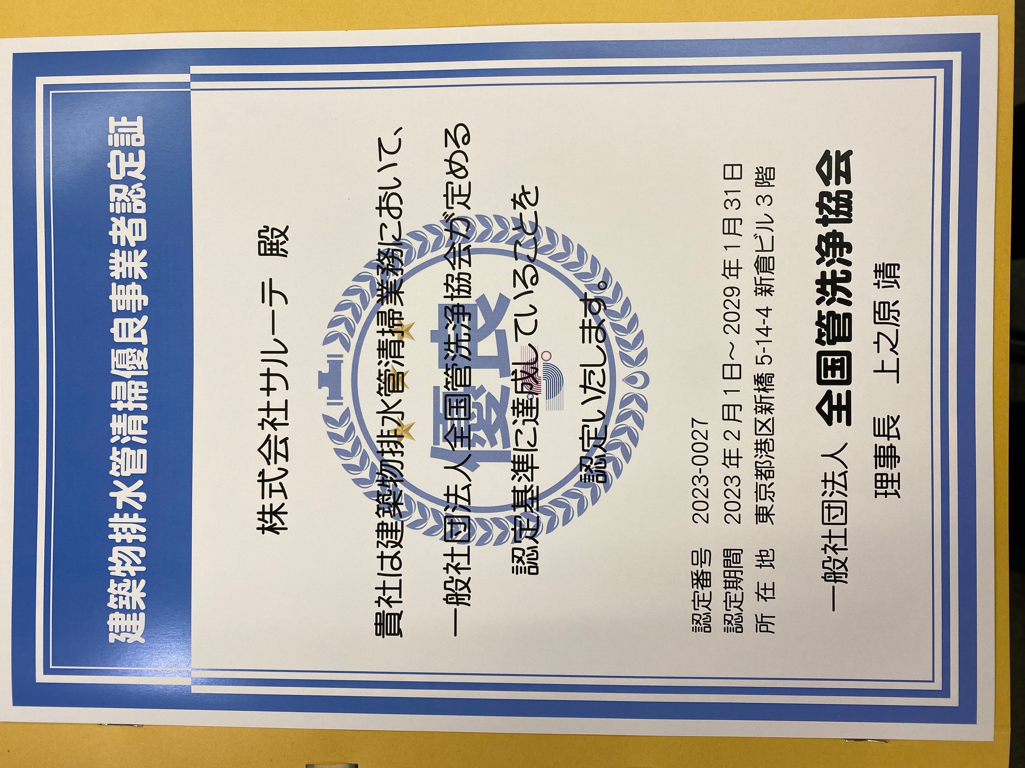 弊社は、一般社団法人全国管洗浄協会より、建築物排水管清掃優良事業者の認定を受けています。